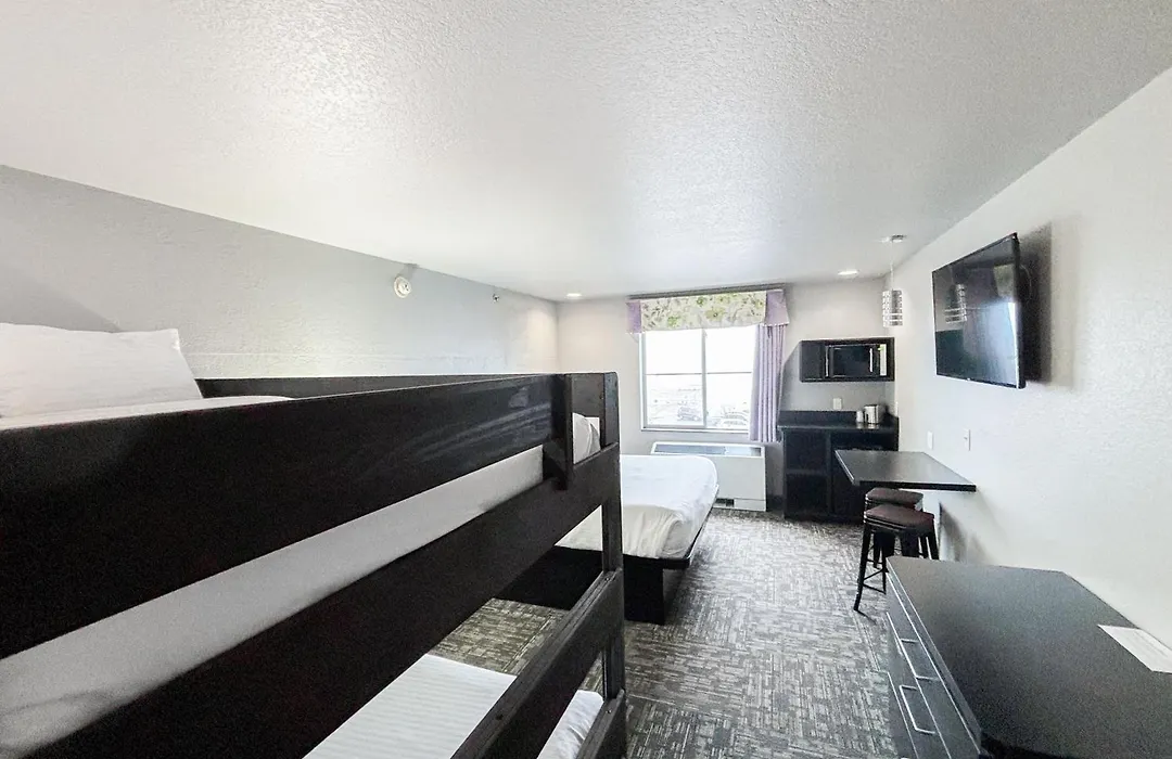 Rooms at Metropolis Resort - Eau Claire include family suites with three queen beds on the floor level and two queen beds lofted from the ceiling. Each room offers a flat-screen TV and access to free Wi-Fi, ensuring a comfortable stay for families.
