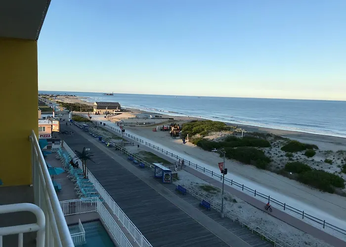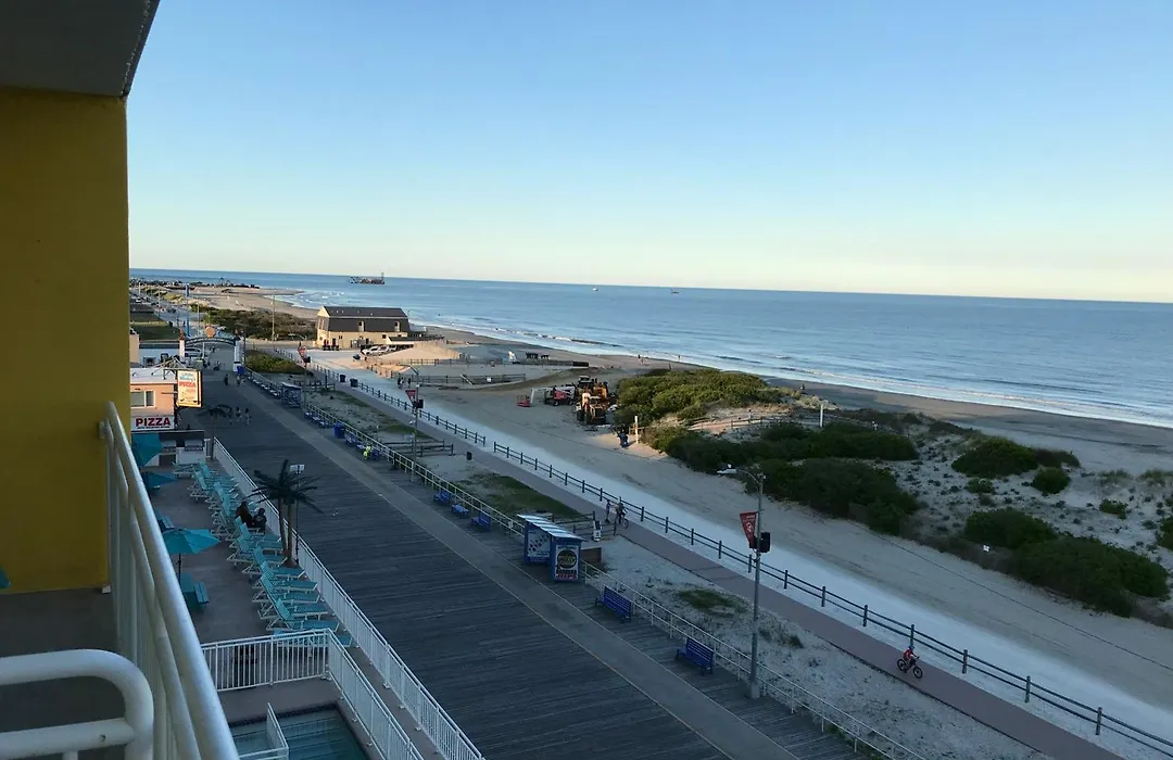 Guests can enjoy the seasonal outdoor swimming pool or relax in the indoor pool. Nearby landmarks include Ocean Oasis Waterpark and Beach Club located 0.3 miles away, and the Wildwood Boardwalk, approximately 0.9 miles from the property.