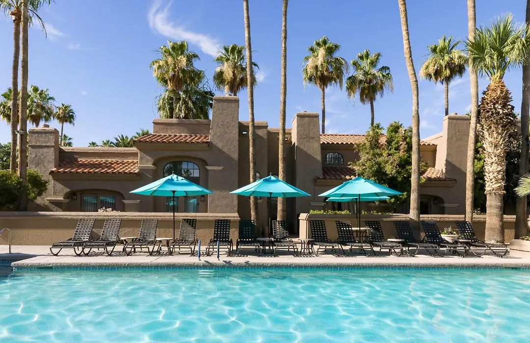 Leisure amenities encompass two outdoor pools and a 24-hour fitness center. The surrounding area provides opportunities for outdoor activities, including hiking at Camelback Mountain and golfing at McCormick Ranch Golf Club, both of which are within a short distance.