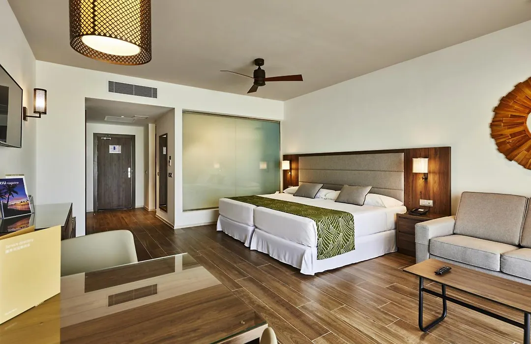 Recreational facilities include an outdoor swimming pool, a hot tub, spa and wellness services with a sauna, and access to various water sports. Guests can reach the nearby Riu Atoll by footbridge, which hosts a children's pool and kids' club.