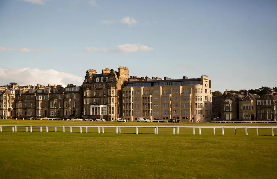 Rusacks St Andrews is a 5-star hotel rated 9.1/10 on Booking.com, known for its prime location near the historic Old Course and luxurious accommodations. The hotel features a rooftop bar, a golf valet service, and pet-friendly options.