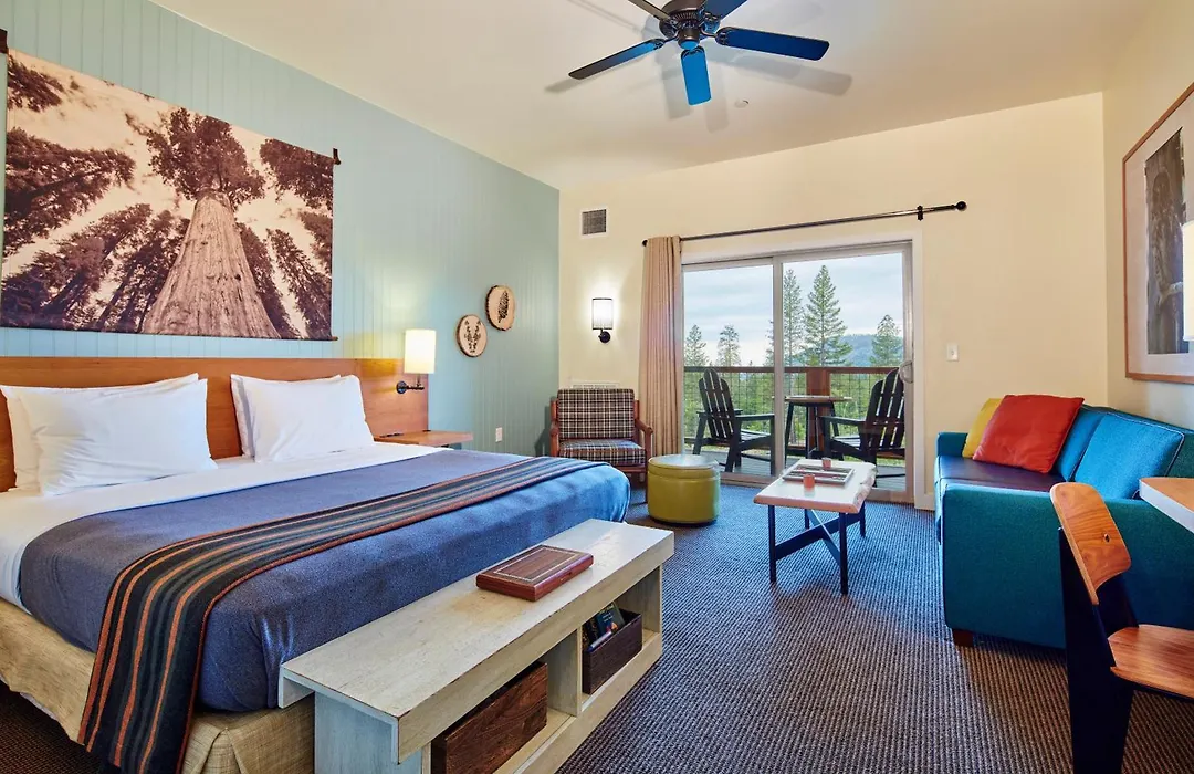 Rush Creek Lodge At Yosemite features a variety of accommodations, including 143 lodge rooms, suites, and hillside villas, designed for groups and families. Each unit boasts an entry foyer, private bathroom, and a master bedroom equipped with a king bed. Villas also include large sitting areas with queen sofa beds and gas fireplaces, ideal for relaxation.