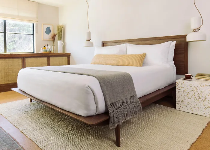 Silver Lake Pool & Inn, a 4-star hotel with an 8.6/10 rating, features an outdoor swimming pool, restaurant, bar, and garden. This stylish hotel offers 54 oversized guest rooms and is known for its California-inspired design elements, with an emphasis on vintage leather furniture and natural light.