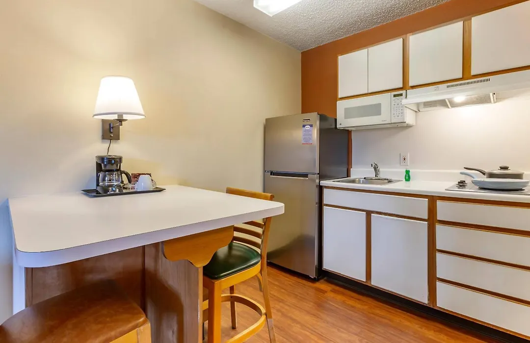 Spacious studio suites at Suburban Studios feature amenities such as air conditioning, heating, desks, and cable TV. Each unit includes a fully equipped kitchen with a refrigerator, two-burner stovetop, and microwave, catering to long-term stays.