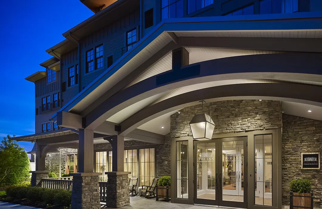 Guest accommodations at The Inn At Chesapeake Bay Beach Club are designed with a blend of rustic charm and contemporary style, featuring luxurious rooms and suites with stunning views. The 77 guest rooms include amenities such as air conditioning, coffee machines, and flat-screen TVs.