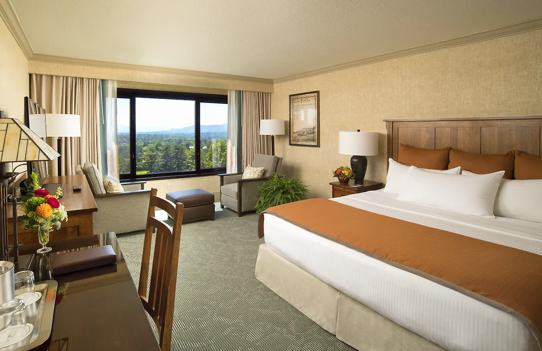 The Omni Grove Park Inn & Spa - Asheville offers 513 guest rooms, ranging from traditional accommodations in the historic Main Inn to deluxe rooms with views of the Blue Ridge Mountains. Rooms include a flat-screen TV, a refrigerator, and free WiFi, with options available for families and pets.