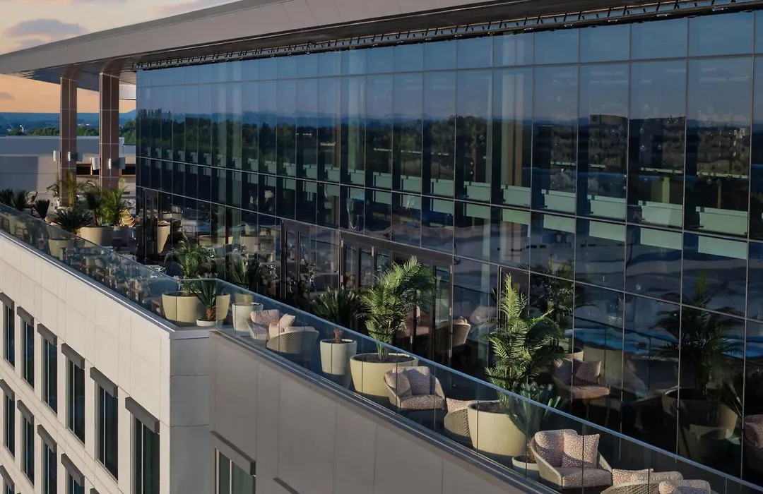 Dining options include the SweetSong restaurant and bar, which serves healthy breakfast, lunch, and dinner, as well as the Overstory Rooftop Bar. Starbucks is also available, offering beverages like cappuccinos and iced coffee.