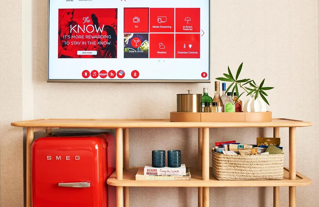 Rooms at Virgin Hotels Dallas feature a unique design with sliding privacy doors, allowing guests to separate sleeping areas from living spaces. Each chamber includes a SMEG mini-fridge stocked with snacks, a flat-screen TV, and a work desk for convenience.