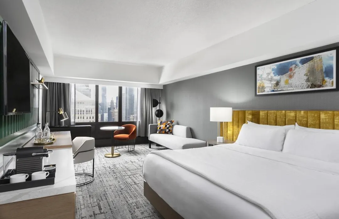 Rooms at Voco Chicago Downtown include a flat-screen TV, a coffee machine, and luxury bath amenities. Guests can choose from various room types, including king and double queen rooms, some with skyline views. Premium rooms offer spacious interiors and luxe touches such as Nespresso coffee makers.